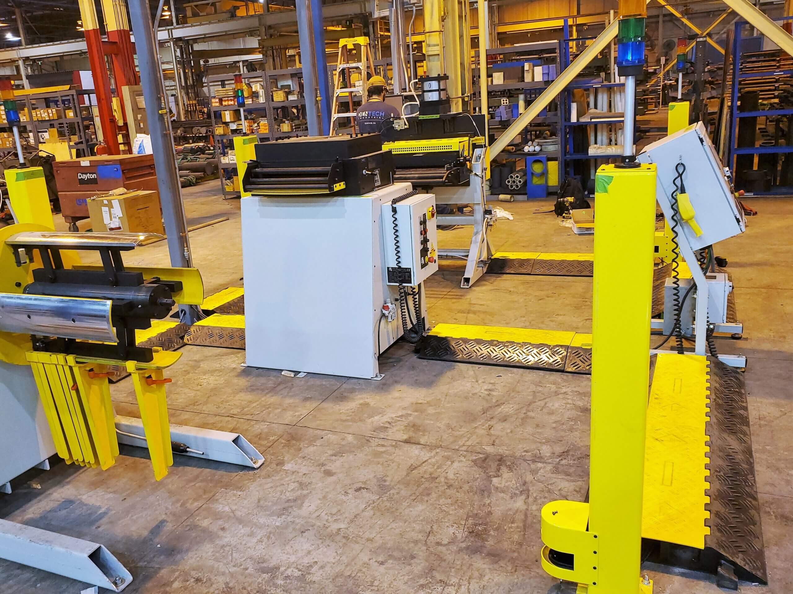 A specialty alloys manufacturer needed to install a sheet metal cut-to-length (CTL) line in their facility. Then they needed a solution for safety controls and machine safety components. The CTL line includes three machines that are located on an open warehouse floor, so part of the challenge was how to run electricity to the equipment.